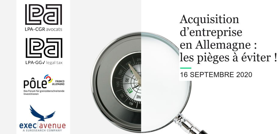 Im Rahmen einer Videokonferenz stellen Ihnen unsere Gastredner die typischen Fallstricke beim Unternehmenserwerb in Deutschland vor und liefern erfolgsversprechende Ansätze zur Unternehmensakquisition unter Berücksichtigung der damit verbundenen arbeitsrechtlichen Aspekte. Autoren: Sandra Hundsdörfer & Steffen Paulmann, LPA-CGR Avocats / Frédérique Genton, Exec Avenue / Michael Heß, Pôle Franco-Allemand