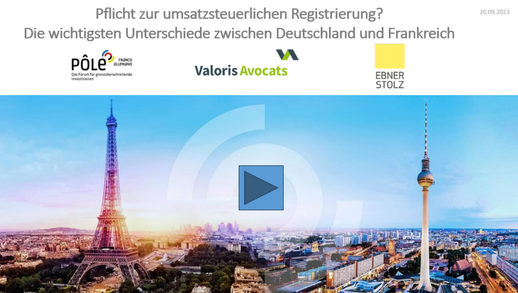 Notre REPLAY du webinaire en allemand « Obligation de s’identifier à la TVA en France ? Principales différences entre la France et l’Allemagne » a été organisé par le Pôle Franco-Allemand et ses partenaires Valoris Avocats et Ebner Stolz le 20 septembre 2023.