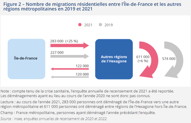 Okzitanien und die Bretagne sowie Centre-Val de Loire und Hauts-de-France waren die Regionen, in die die Zuzüge aus der Île-de-France am stärksten anstiegen. Umgekehrt sind die neuen Einwohner der Île-de-France aus den anderen Metropolregionen 2021 fast genauso zahlreich wie 2019 (122.000 bzw. 120.000).